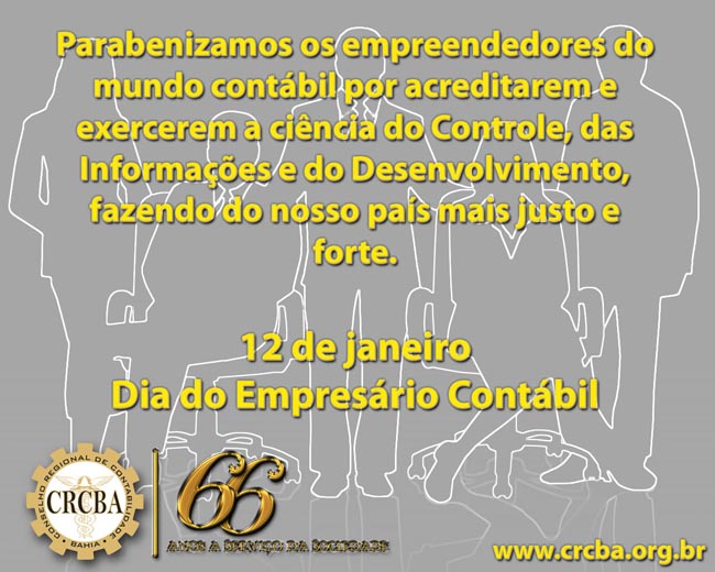 Gostaria de parabenizar os 3.716 empresários contábeis baianos, representados por seus escritórios e organizações, por acreditarem e empreenderem na Contabilidade como meio de vida, gerando renda e empregos. No domingo (12/1), foi comemorado o Dia do Empresário Contábil, e nós gostaríamos de homenagear esse importantíssimo segmento de nossa classe, dada a sua importância para a sociedade.
