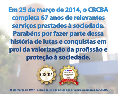 Gostaria de iniciar a edição 448 do CRCBA Notícias falando da data simbólica de hoje (25/3) em que comemoramos 67 anos de relevantes serviços prestados à sociedade, pois em 25 de março de 1947, era empossada solenemente os primeiros membros do Plenário do CRCBA, em reunião do Sindicato dos Contabilistas do Estado da Bahia. Há 50 anos também celebramos a Lei 4.320/64 (Lei de Contabilida Pública) e guardamos na nossa memória o Golpe Militar de 31/3/1964 como uma etapa superada em nosso cenário político e social. Seguimos avançando em prol do sucesso de nossa classe e do bem estar de nossa sociedade, e parabenizamos todos os profissionais baianos que fazem parte dessa história.