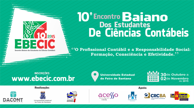 O Encontro Baiano dos Estudantes de Ciências Contábeis – EBECIC é o fórum máximo de discussão entre os estudantes de contabilidade do estado da Bahia; o evento ocorre anualmente nas principais cidades baianas e, neste ano de 2015, acontecerá pela terceira vez no município de Feira de Santana, de 30/10 a 02/11. Em todas as suas edições, o encontro tem sido palco de debates sobre os mais importantes temas relativos não só à qualidade da formação universitária, mas também às questões profissionais, à Universidade e à sociedade como um todo. Para esta edição, a equipe organizadora do 10º EBECIC propôs como tema geral a ser debatido: “O profissional contábil e a responsabilidade social: Formação, consciência e efetividade”. A programação completa e as inscrições do encontro estão disponíveis no site: ebecic.com.br