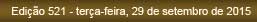 Profissionais da Contabilidade: Gestores de organizações contábeis: Medida Provisória nº 692, de 22 de Setembro de 2015. Altera a Lei nº 8.981, de 20 de janeiro de 1995, para dispor acerca da incidência de imposto sobre a renda na hipótese de ganho de capital em decorrência da alienação de bens e direitos de qualquer natureza, e a Medida Provisória nº 685, de 21 de julho de 2015, que institui o Programa de Redução de Litígios Tributários – PRORELIT. (Leia mais) Lei nº 13.373/2015 , de 22 de Setembro de 2015. Altera a Lei nº 7.014, de 04 de dezembro de 1996. (Leia mais) Não foram publicadas novidades no site da SEFAZ- Salvador durante o período de aputração dessa edição. ECF: Empresas enfrentam problemas para entrega. Fonte: Jornal Contábil - www.contadores.cnt.br