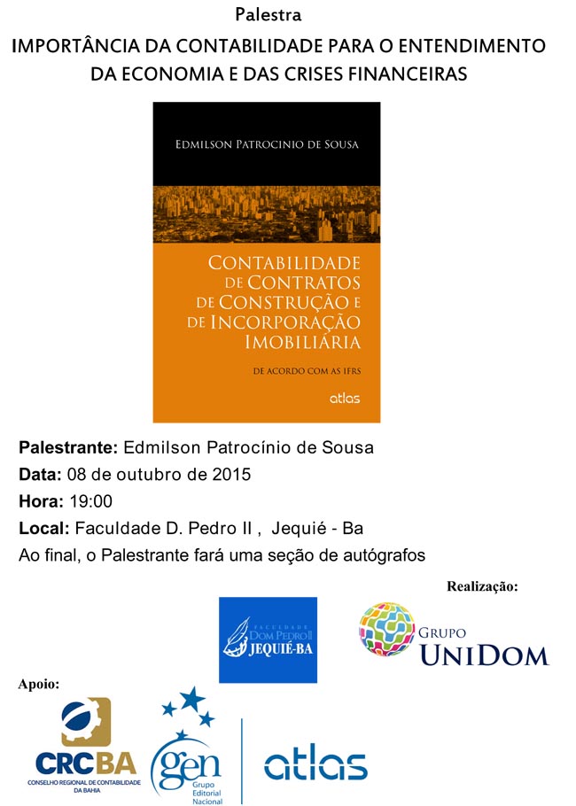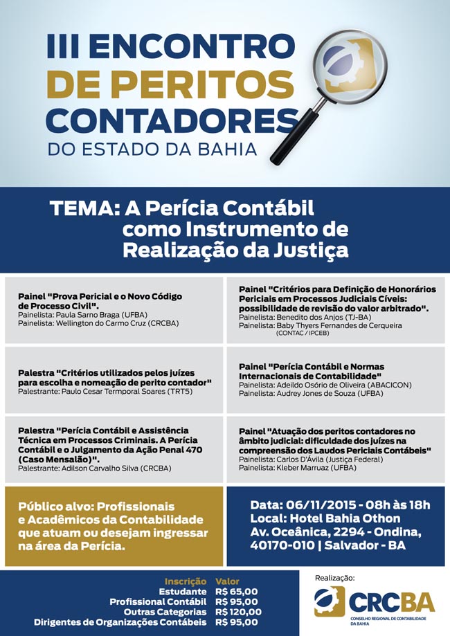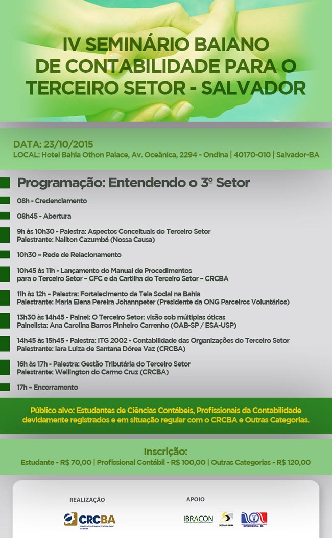 A Jornada de Conhecimento Contábil de Jacobina é uma realização do Conselho Regional de Contabilidade do Estado da Bahia (CRCBA), Conselho Federal de Contabilidade (CFC), da 3ª Delegacia do CRCBA em Jacobina e contou com o apoio da Associação Comercial e Industrial de Jacobina (Acija) e Certificação Digital (Certisign). As inscrições foram gratuitas e os participantes doaram duas latas de leite em pó, doadas a instituições de caridade da localidade.