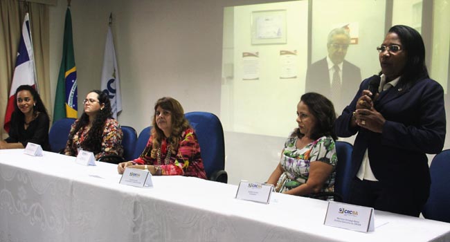 Mesa diretora da audiência pública, com presença da ouvidora geral do CRCBA, Iara Luísa Dórea, e da delegada do CRCBA em Camaçari, Marineide Nunes, dentre outros representantes locais.