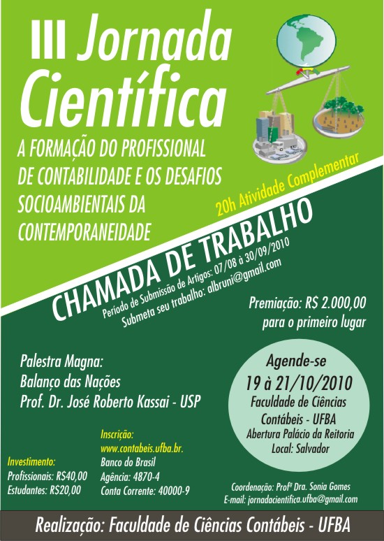 A quarta edi��o do Semin�rio em Homenagem ao Dia do Contador, evento que vem se transformando em tradi��o no estado e que re�ne a Classe Cont�bil baiana neste dia de comemora��o, teve a presen�a de mais de 1000 pessoas. O semin�rio aconteceu no �ltimo s�bado (25/09/2010), no Fiesta Bahia Hotel, na cidade de Salvador � BA. Com o tema �Contabilidade e o Mundo Corporativo�, a programa��o foi bastante diversificada, com direito a palestras sobre temas como as IFRS no Brasil e Auditoria P�blica, at� apresenta��es art�sticas, homenagens e solenidade de entrega de carteiras profissionais ao fim do evento. (Veja mais)