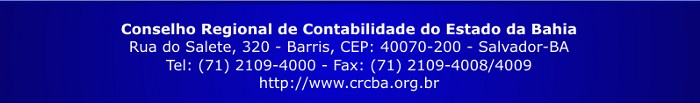 As not�cias exibidas semanalmente pelo Boletim Eletr�nico do CRCBA s�o extra�das dos principais peri�dicos do pa�s e, portanto, s�o de inteira responsabilidade de quem as publicou originalmente, ficando, assim, o CRCBA isento de quaisquer responsabilidades pelo conte�do das informa��es.
