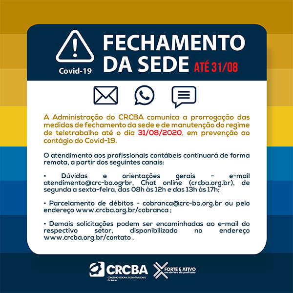 O Conselho Regional de Contabilidade do Estado da Bahia – CRCBA lança a campanha “Contabilidade pela VIDA – ajudando pessoas e organizações a seguirem em frente”, que tem o objetivo de ajudar cidadãos, empresários e profissionais contábeis a seguirem suas vidas da melhor forma possível, durante a grave pandemia que assola todo o mundo. Para tanto, o CRCBA mobilizou o Programa de Voluntariado da Classe Contábil – PVCC, em âmbito estadual, e suas Comissões Técnicas, para esclarecerem dúvidas sobre o Benefício Emergencial, disponibilizado pelo Governo Federal; sobre as possibilidades de Manutenção de Emprego, presentes na MP 936; e dúvidas dos profissionais contábeis, acerca das alterações nas legislações tributárias, trabalhistas e previdenciárias, oriundas do estado de pandemia global. Saiba +